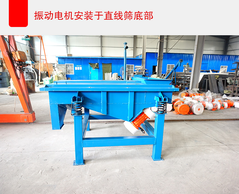 當然,也可以通過減少直線篩的篩框等整體寬度來解決這個問題,但這樣會造成設備的有效篩分面積減少,導致處理量變小,影響篩分效率、生產進度,所以可以選擇將振動電機安裝在設備的底部,以此來減少直線篩的整體寬度,這樣即保證了設備的有效篩分面積,不影響處理量和篩分效率,也大大減小了直線篩設備的整體寬度。