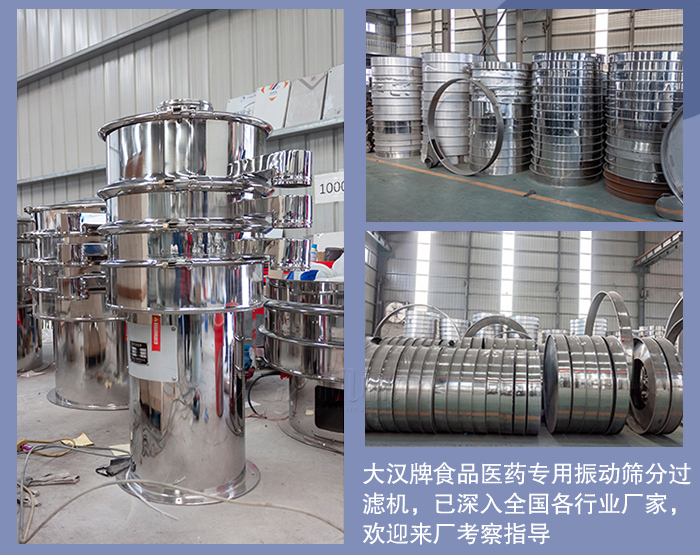 目前,大漢牌食品醫藥專用振動篩分過濾機,已深入全國各行業廠家,歡迎來廠考察指導,由您的建議我們會做的更好,大漢振動篩-致力于解決各種篩分難題,電話0373-2682333 聯系人:王現峰、24小時服務手機15893808811隨時恭候您的來電。