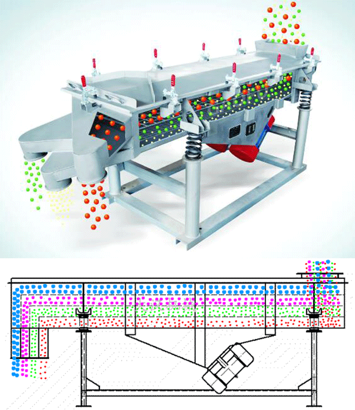 多層直線振動篩是將物料篩分為2-6個不同等級的物料