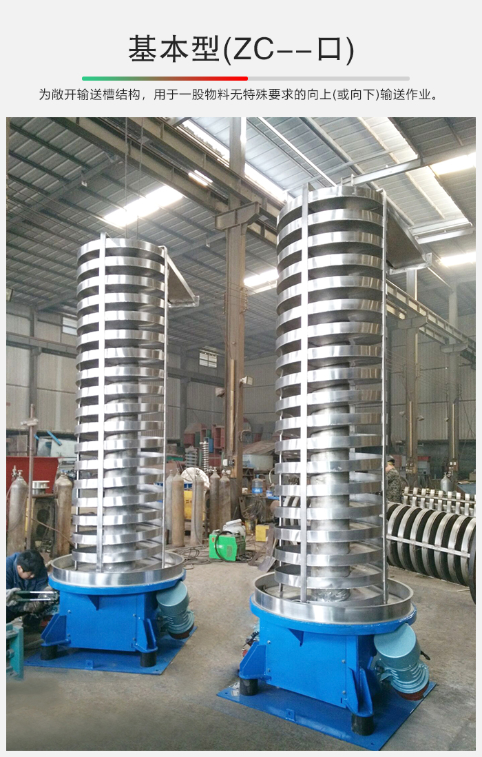 SZC系列垂直振動提升機的驅動裝置振動電機安裝在輸送塔下部,兩臺振動電機對稱交叉安裝,輸送塔由管體和焊接在管體周圍的螺旋輸送槽組成,輸送塔座于減振裝置上,減振裝置由底座和隔振彈簧組成。當垂直輸送機工作時,根據雙振動電機自同步原理,由振動電機產生激振力,強迫整個輸送塔體作水平圓運動和向上垂直運動的空間復合振動,螺旋槽內的物料則受輸送槽的作用,作勻速拋擲圓運動,沿輸送槽體向上運動,從而完成物料的向上(或向下)輸送作業。